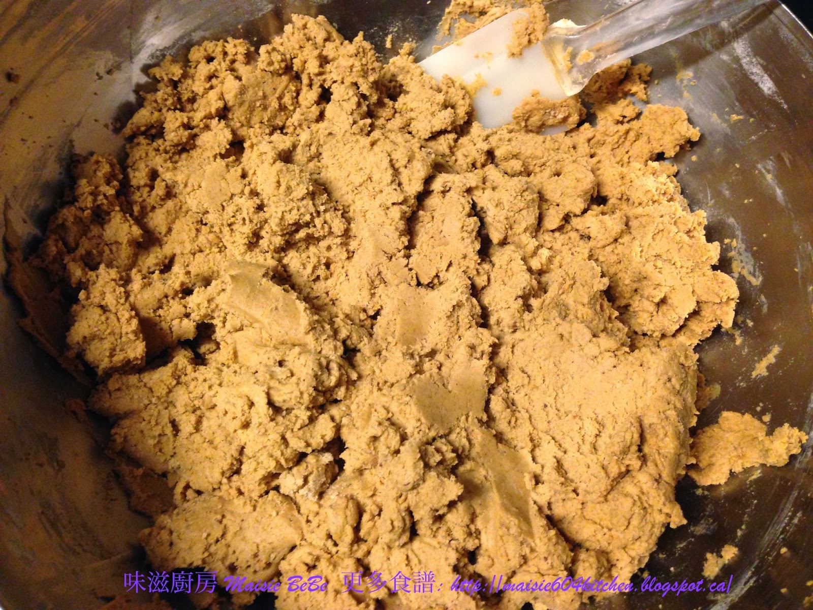 分兩至三次倒入篩好的麵粉類。第一二次可用電動搞拌器拌勻,第三次用膠刮輕手拌勻,成一麵團。