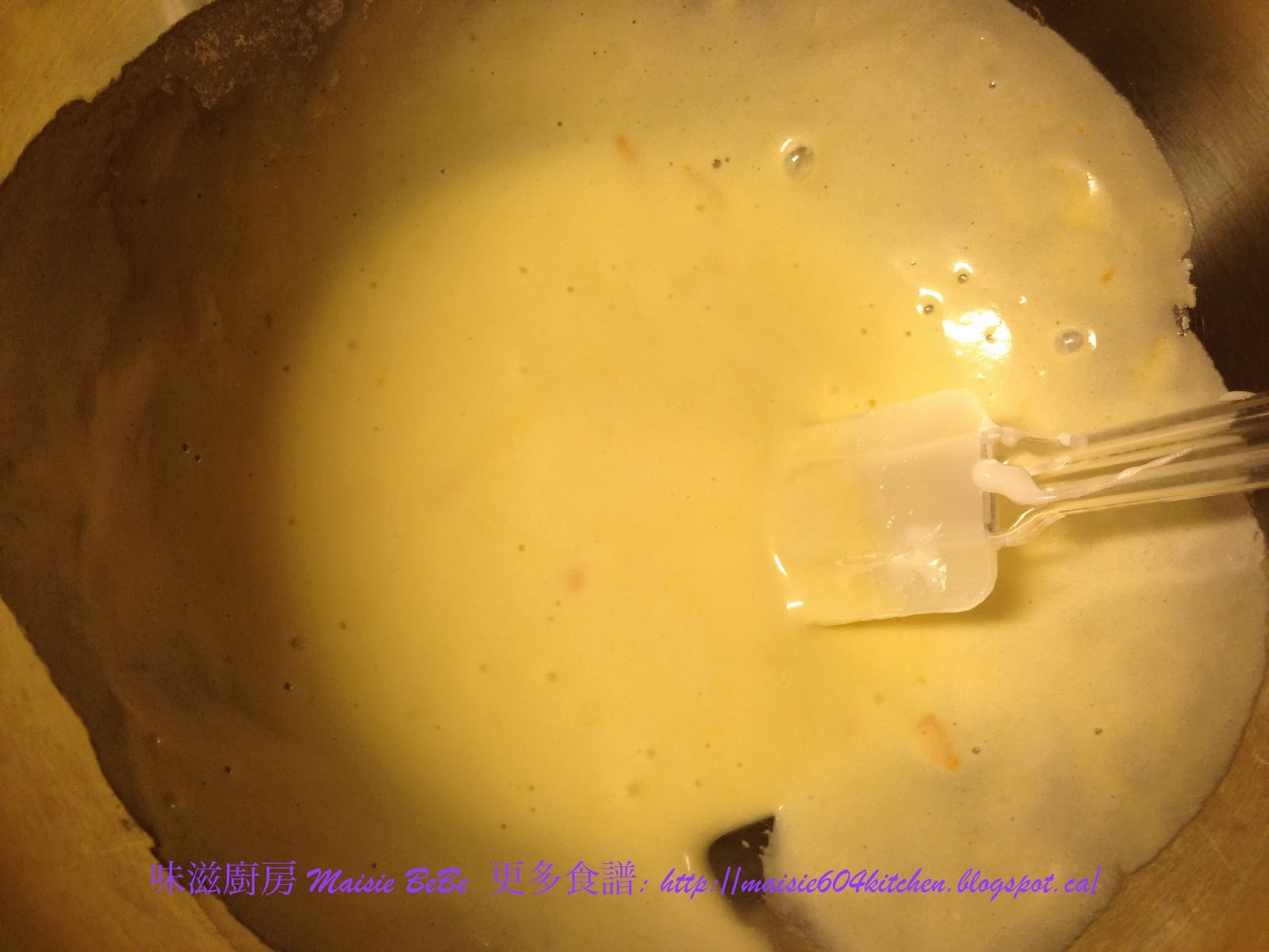 鮮橙皮碎和1湯匙橘子白蘭地酒入麵糊攪拌均勻。加蛋黃和雲呢拿香油,攪拌至光滑。